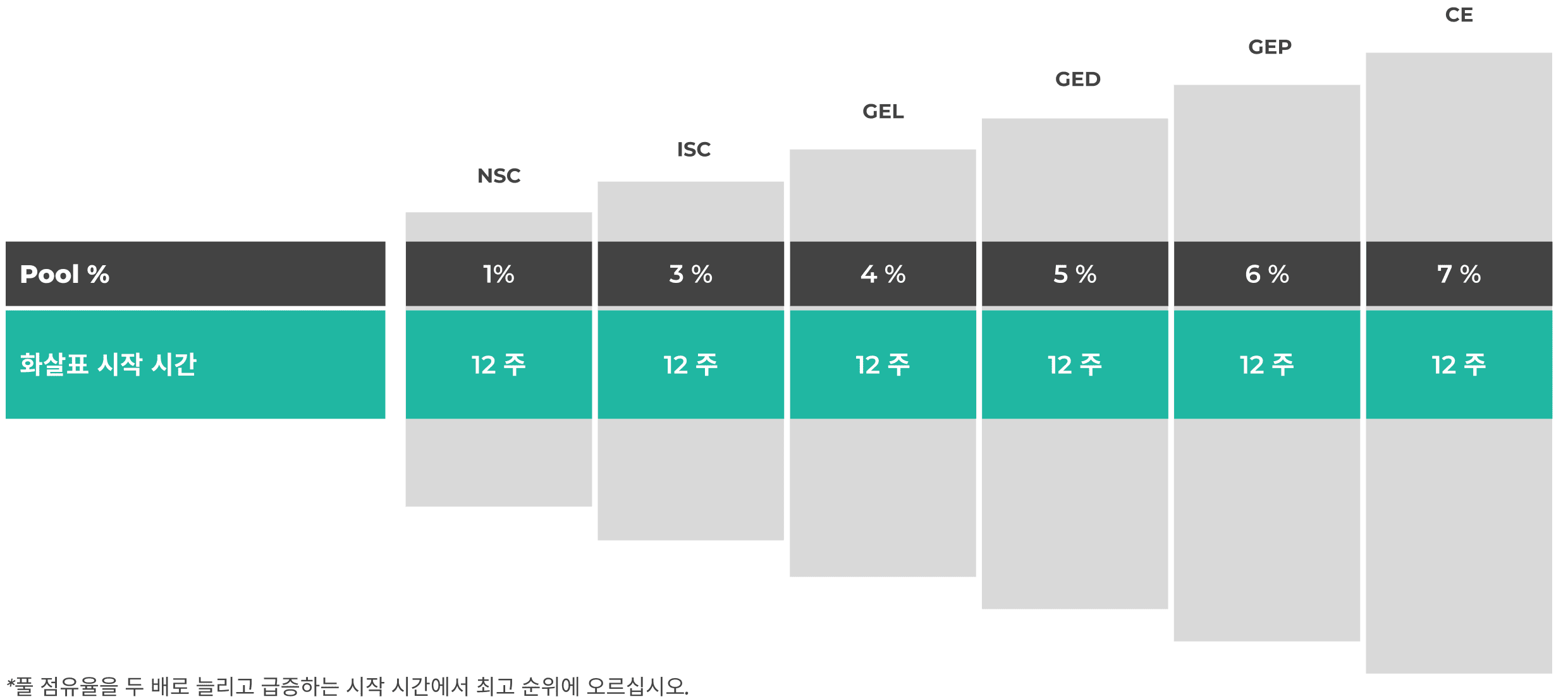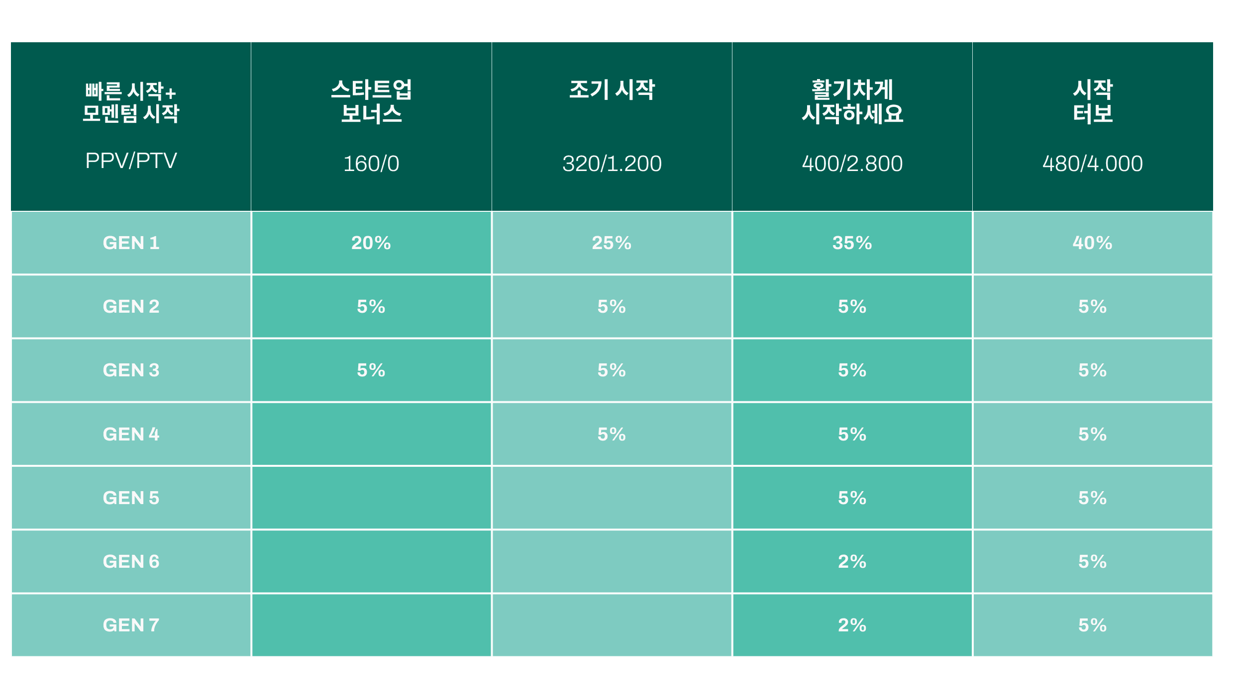 첫 12주 동안인 모멘텀 스타트 기간 동안 우리는 귀하가 최고의 보너스 계획 순위를 달성하고 조직의 팀 볼륨에 따라 주간 지급액이 최대 85% = 80%의 패스트 스타트 PV까지 되도록 지원을 제공합니다.