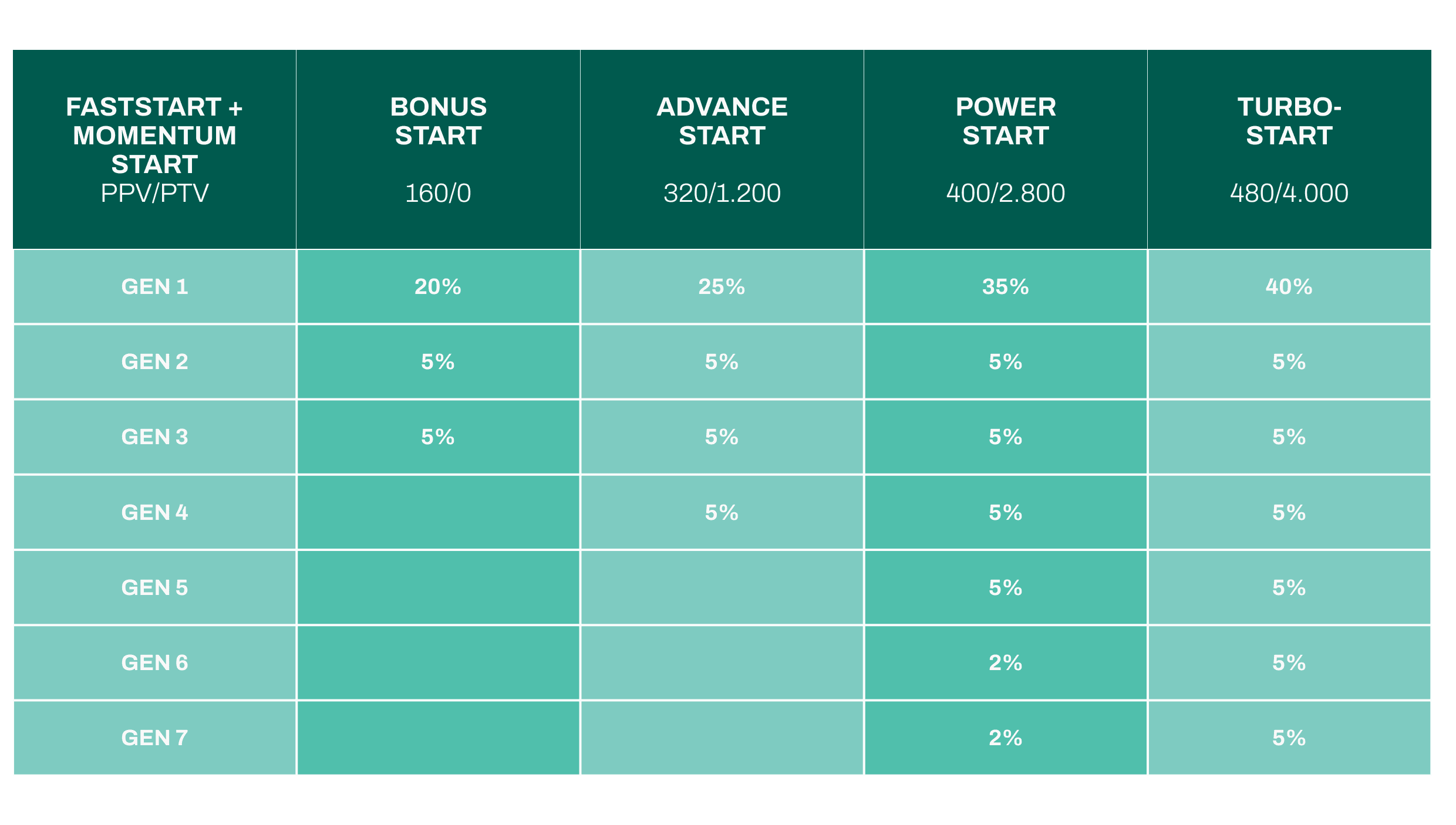 During your first 12 weeks, known as the Momentum Start, we provide extensive support to help you achieve top bonus plan ranks and enjoy weekly payouts of up to 85% = 80% of Fast Start PV based on the team volume of your organization.
